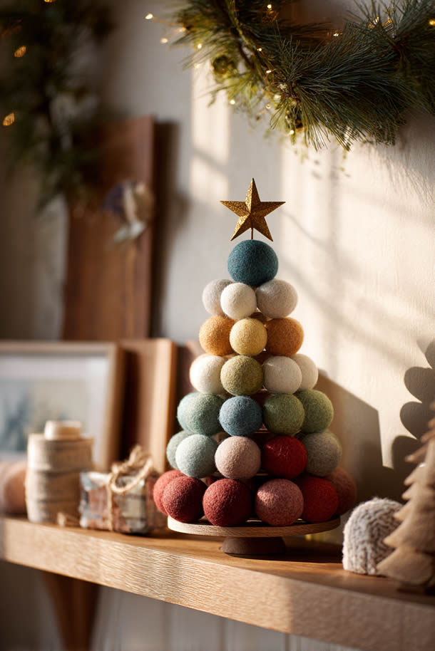 The neutral tone lets colorful ornaments pop while grounding bold Christmas schemes with organic calm.