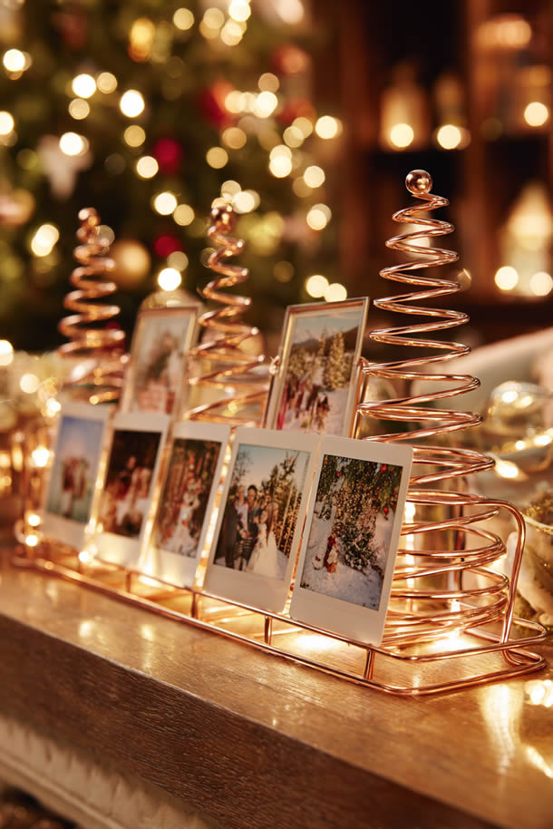 Copper wire shaped into spirals creates elegant photo holders that showcase favorite holiday memories beautifully.
