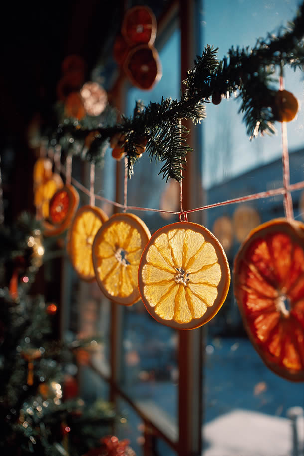 Dehydrated citrus wheels strung horizontally create window garlands that glow like stained glass when backlit.