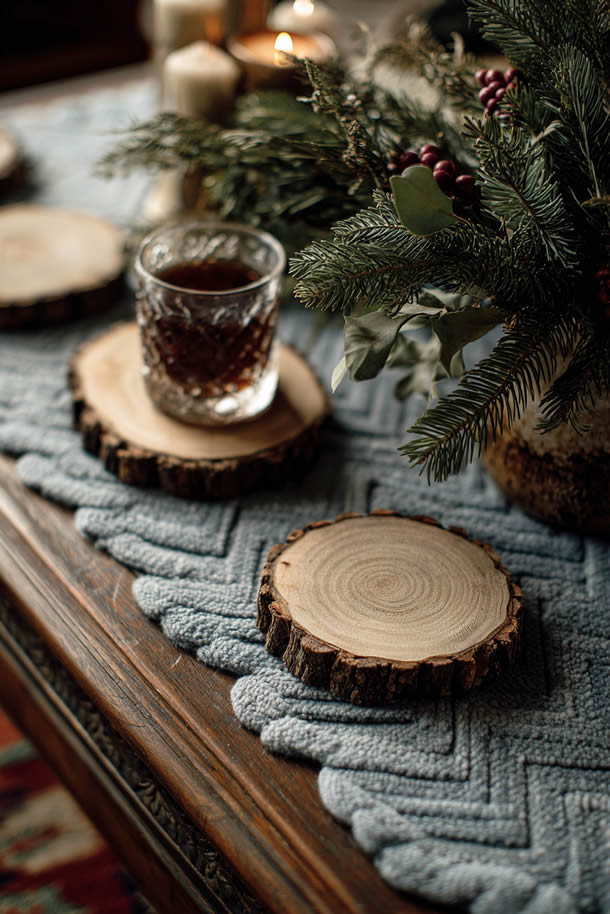 Tree branch slices become charming coasters that protect surfaces while adding natural holiday warmth.