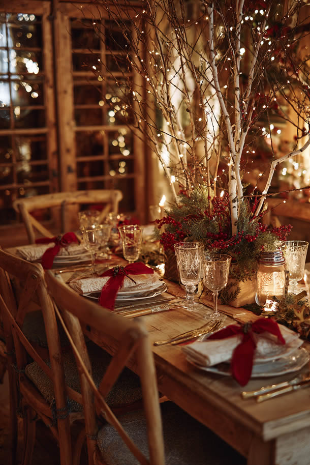 Wired burlap toppers bring cozy cabin vibes that feel perfectly on-trend for modern Christmas.