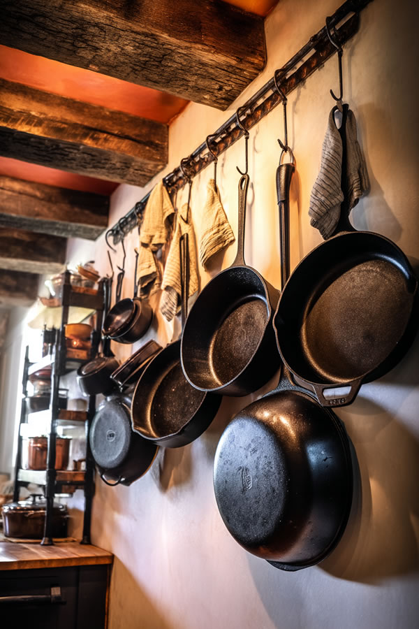 Vintage cast iron skillets hung on walls become functional art that references authentic farmhouse cooking traditions.