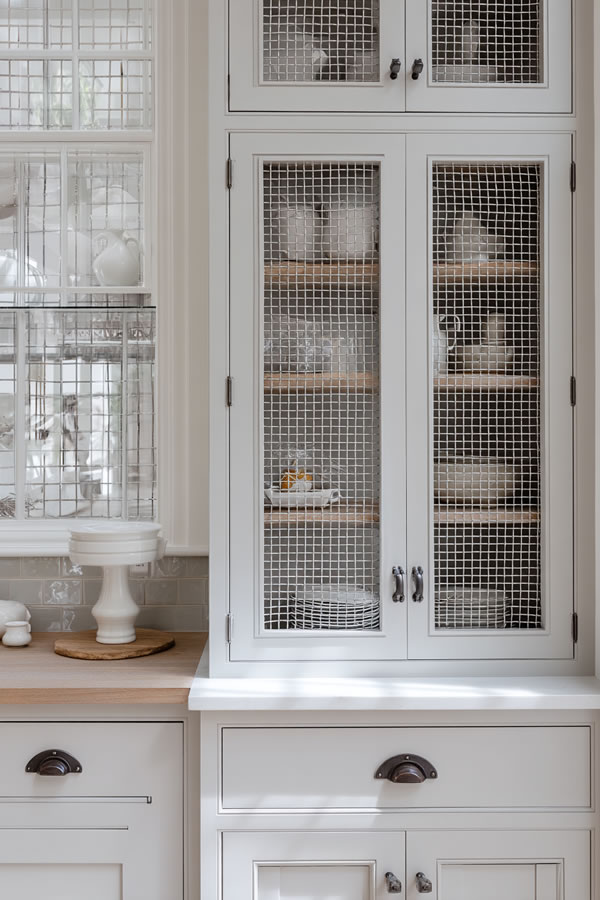 Replacing glass panels with chicken wire creates rustic texture while maintaining the open display functionality clients love.