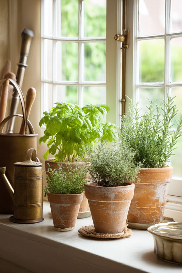 Fresh herbs in terracotta pots bring life and fragrance that artificial decorations simply cannot match for authenticity.