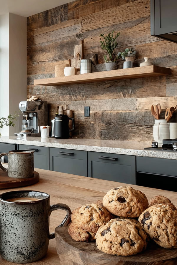 No space for full walls? Try a shiplap backsplash that delivers the same cozy vibe with half the effort.