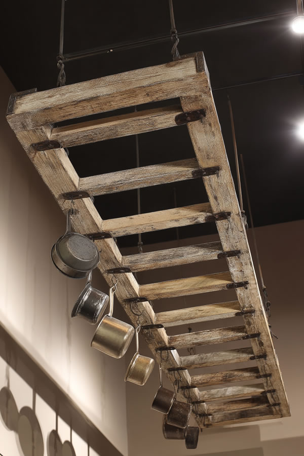 Old wooden ladders repurposed as pot racks bring height and storage while adding architectural interest overhead.