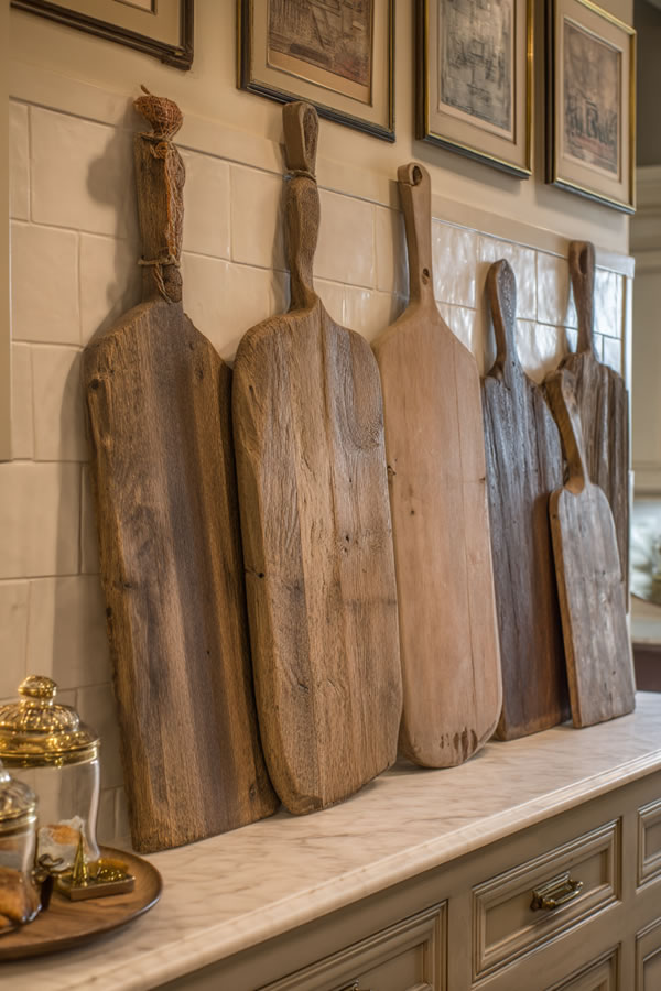 Vintage cutting boards displayed vertically create instant farmhouse character while staying functional for daily meal prep.