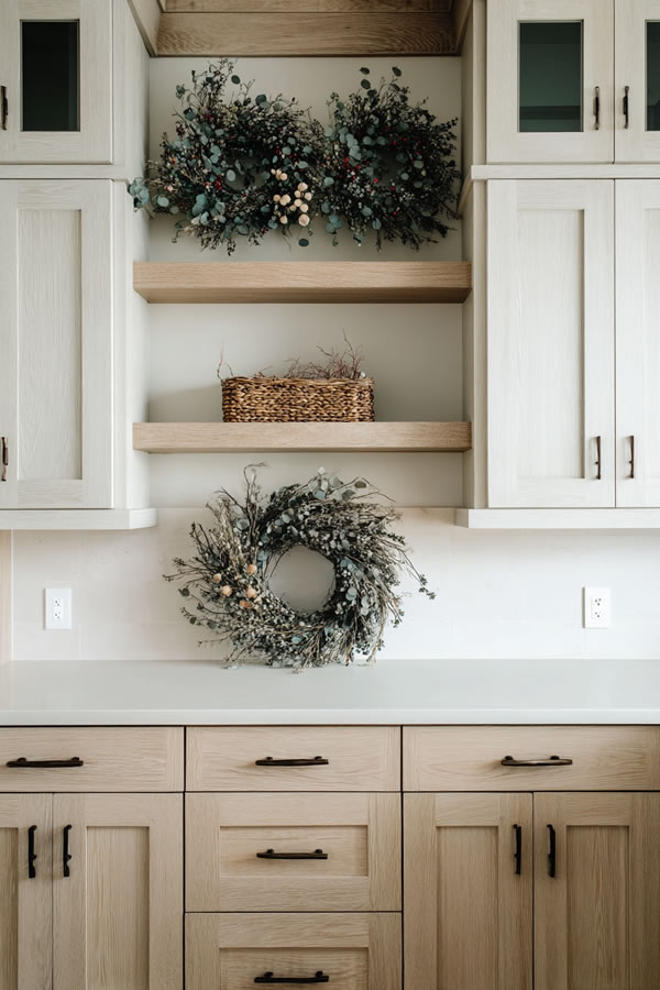 Seasonal wreaths on cabinet doors bring natural elements that change throughout the year for continuous fresh looks.